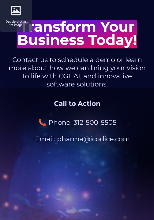 Contact us to schedule a demo or learn more about how we can bring your vision to life with CGI, AI, and innovative software solutions.Phone: 312-500-5505Call to ActionEmail: pharma@icodice.comTransform Your